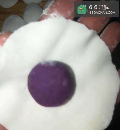 4干成面皮,把紫薯球包起来;