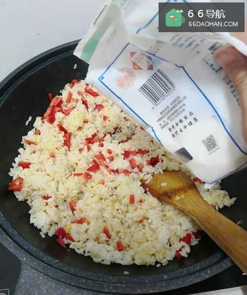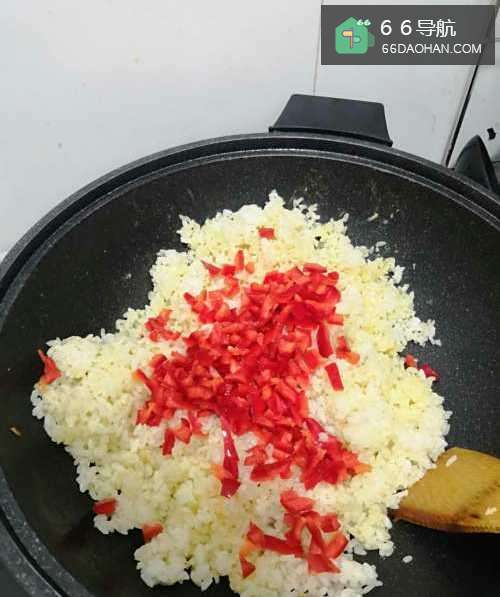 4米饭用锅铲压成一粒粒的时候放入红辣椒翻炒。