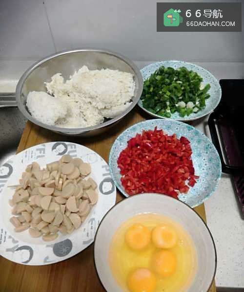 葱切碎,香肠、红辣椒切丁,鸡蛋加盐打散,米饭准备好。
