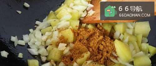 6把炒锅上火,放些蒜末,土豆和元葱倒入,翻炒,倒入咖喱粉,炒均匀。