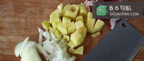 我们把牛肉洗净,切成小块,土豆切小一些的块,元葱切丁。