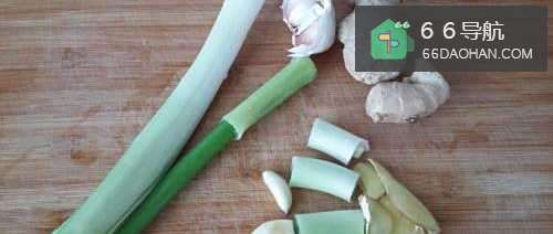 3把葱切成段,姜切成片,蒜用刀拍碎。