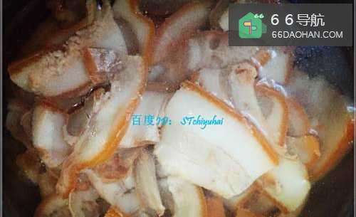 5猪头肉炸过之后加入八角滕椒等调味,再加入少许水,收拢大火焖炖一阵。