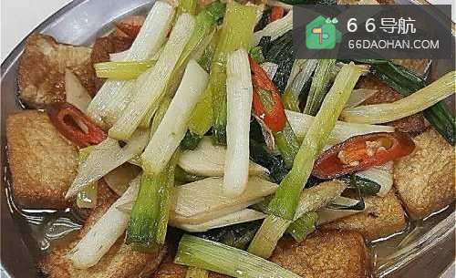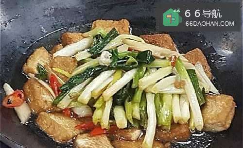 3再将葱段、辣椒也炸出香味,捞起放在豆腐上。
