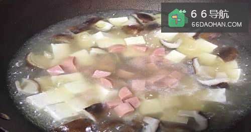 5倒入之前备好的豆腐块、火腿肠丁