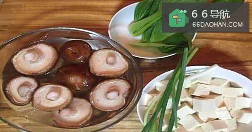 鲜香菇洗净(如果是香菇干需要提前用温水泡开),豆腐切块、上海青去蒂,香葱洗净备用。