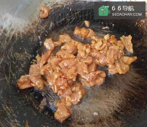 13下生葱的葱白部分和最开始炒制好的猪肉,翻炒几秒再把葱叶下下去