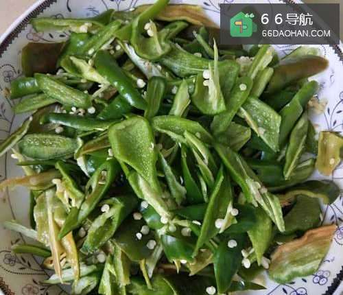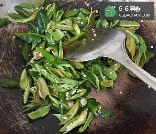11把刚刚削好的辣椒放下锅,可以加一点点盐,不要多,让辣椒入围就好