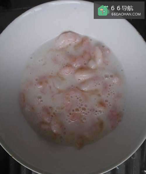 3将蛋清、水淀粉倒入盛有虾仁的小碗中,将他们搅匀,使虾仁充分被蛋清和水淀粉包裹,同时可放少许料酒或生抽去腥。