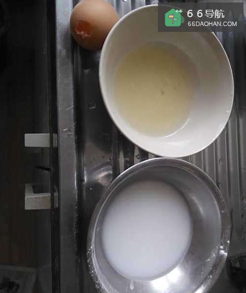 2将鸡蛋的蛋清倒入碗中,蛋黄留在壳中备用。