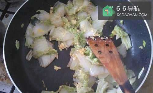 9菜帮和菜叶都炒的差不多了,便将刚才准备好的蛋黄叶浇在白菜上边,然后慢慢翻炒。