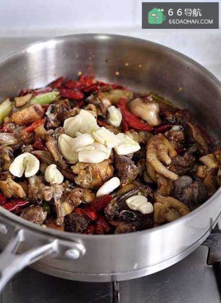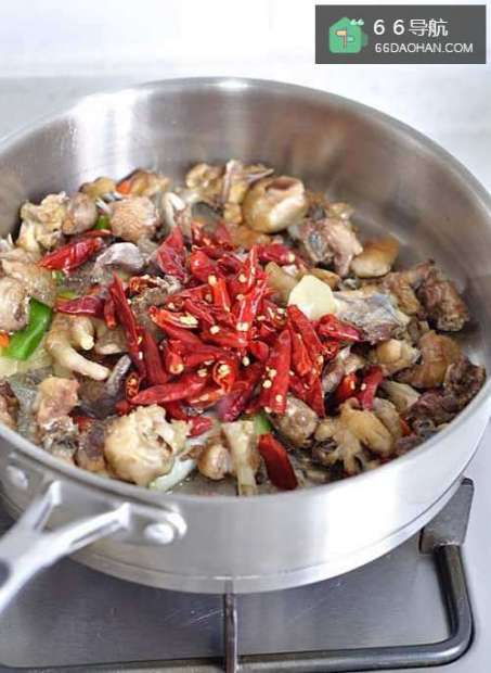 11再把鸡肉倒进去翻炒片刻,把干辣椒段放进去翻炒均匀