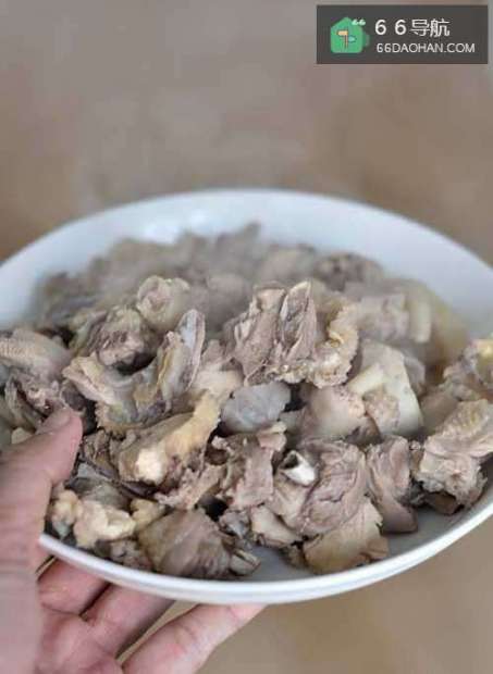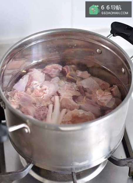 5锅里倒适量水,水烧开后转至小火,把鸡肉倒进去焯水