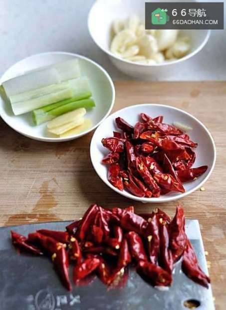 3把干辣椒洗净后浸泡几分钟,然后切成段备用