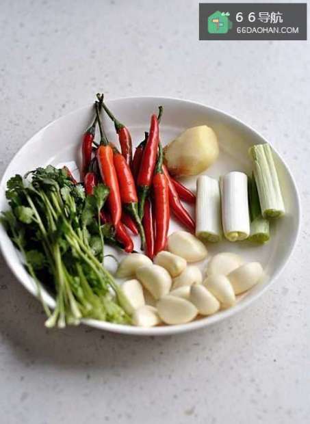 2把红尖椒、大葱切段,姜切成片,香菜、大蒜洗净