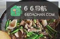 7蒜苗翻炒半熟时放入刚刚焯过水的鱿鱼和腰花翻炒;