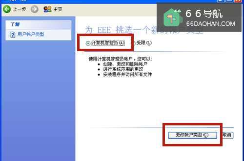 点击【我的电脑】→【控制面板】→【用户帐户】→选择一个受限的帐户→【更改帐户类型】→设置帐户类型为【计算机管理员】→【更改帐户类型】→获得管理员权限。
