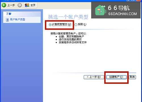 6挑选一个帐户类型,单选【计算机管理员】,点击【创建帐户】。
