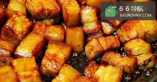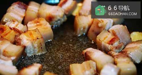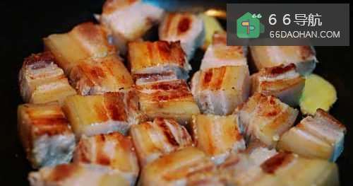 6把五花肉码放在平底锅里,中小火把肉块每一面都煎至金黄色