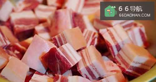 五花肉切块儿,凉水浸泡23小时后,用清水把血水洗干净备用