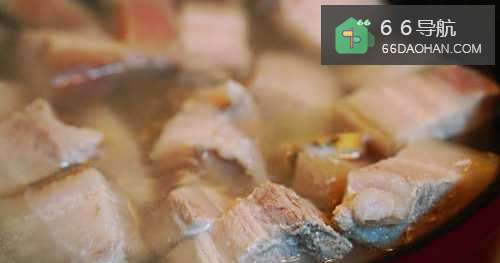 然后把肉块倒进铁锅,加入之前煮肉剩下的清汤