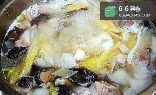 用汤锅装适量水,将白菜、 白萝卜、菇类先小火炖煮。