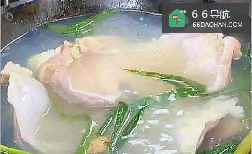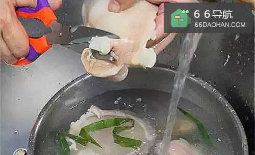 2猪肚先用面粉、白醋反复清洗干净,然后起一个水锅放入葱、姜片、米酒、白醋川烫煮猪肚约20分钟。