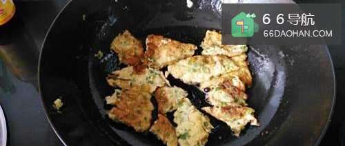 6煎至两面金黄,就可以关火了,用锅铲将鸡蛋饼划成小块,就可以出锅了