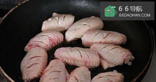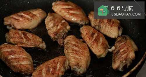 5平底锅里倒少量油,油热后把鸡翅码放上去
