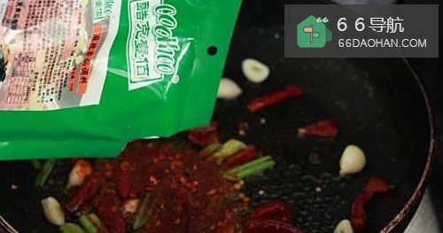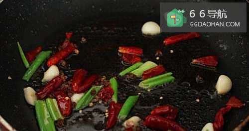 8取适量油倒进锅里,把蒜片、干辣椒、葱段、花椒放进煸炒出香味