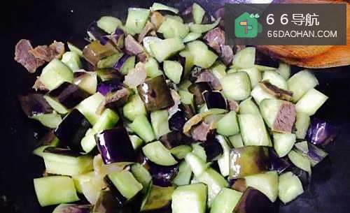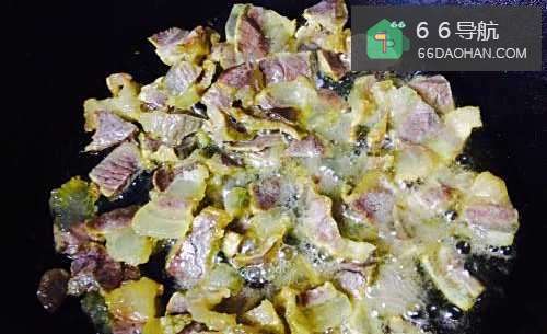 3待腊肉的肥肉部分油脂全部被编出来之后把切好的茄丁倒进去大火快速翻炒。