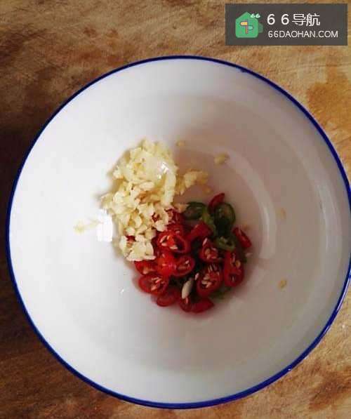 3将蒜切成碎,红绿椒切成小段放入碗中