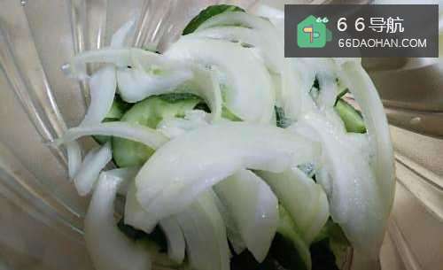 2黄瓜拍一下切碎、洋葱切成条,放到碗中撒上食盐腌一下,控出水分。