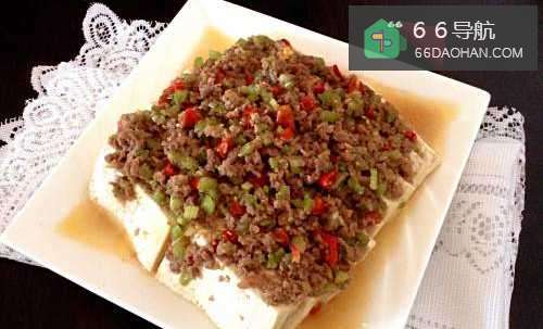 7最后,将蒸好的豆腐出锅,倒掉蒸出的汤汁,将炒好的芹菜肉末均匀的盖在豆腐上。