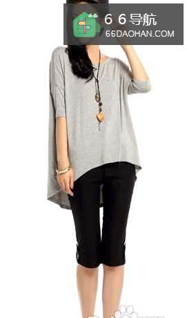 7OL女性平日整天地呆在办公室里,久坐难以自如活动,穿上这件不对称的蝙蝠袖感觉T恤就可以成功地遮盖住上身的松弛赘肉啦;搭配黑色修身的7分裤,成功拉长腿部曲线,更显高挑动人!