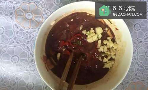 2将猪肝切片放入碗中,加入切好的泡红椒、仔姜片、剁碎的大蒜,少量料酒跟淀粉,腌制10分钟左右;