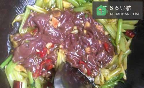 6随后加入腌制好的猪肝,大火炒至猪肝变色即可加入少量精盐,装盘上桌。