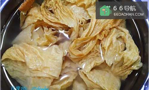 3准备少许豆腐皮干,取一个干净的碗,用冷水浸泡豆皮,不建议用热水,热水浸泡会影响其口感,冷水浸泡时间久一些,如果要加快浸泡,可以过一会用手揉搓后,重新换干净的冷水。