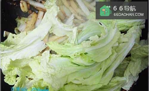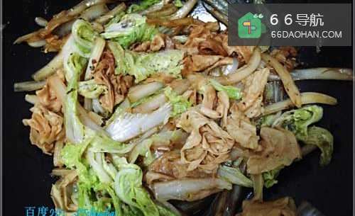 5翻炒一会待白菜细条基本变色以后,加入白菜叶,前面浸泡的豆皮可以捞出洗净,然后切成小段放入,混合翻炒。