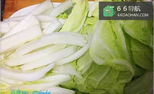 2白菜叶比较容易熟透,菜茎比较难熟透,所以考虑将其分开,将洗净的白菜叶用手撕下菜叶,然后用菜刀将菜茎切成等长细条状,装盘备用。
