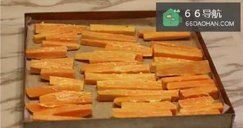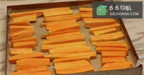 2红薯削皮切细条,放在烤盘上。
