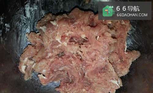 2将猪肉切成碎片,与地瓜粉调和,使其调匀。