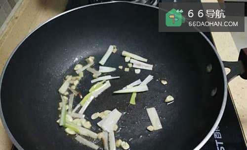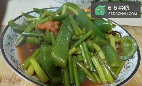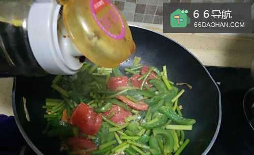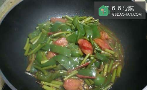 3刷干净锅,接着放好花生油,待油热后放葱姜蒜爆香,(加一点酱油香味就出来了),然后加入西红柿炒一下,让西红柿的汁煸炒出来,放青椒蒜苔接着翻炒。