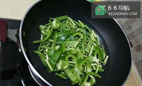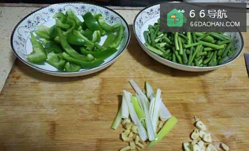 2锅中放入适量清水,把青椒和蒜苔放进去焯一下。