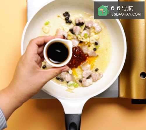 4稍后,倒入花椒、豆豉翻炒均匀,豆瓣酱20克,生抽50克,翻炒出红油;