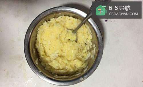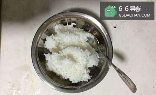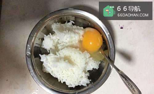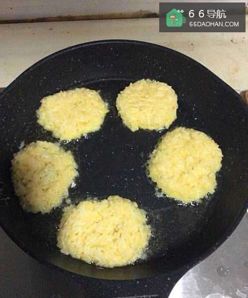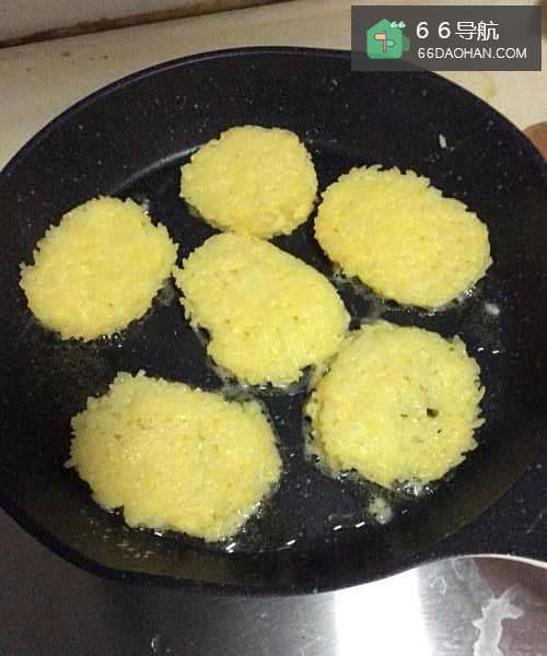 6用勺子挖一勺米饭到锅中,轻轻按压成圆饼状,小火慢煎