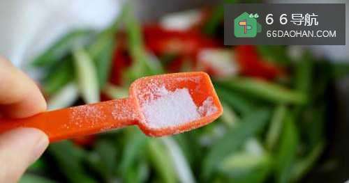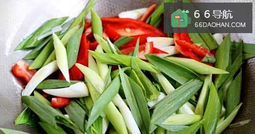 4锅内放适量的色拉油,放入蒜苗、红辣椒翻炒均匀;