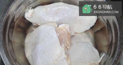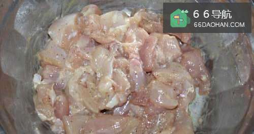 2将鸡腿剔除骨头,然后去皮切块,放入盐、胡椒粉、蛋液、淀粉、蚝油、料酒腌制2个小时。