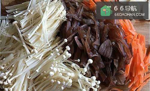 蒜头切片、木耳红萝卜切丝、金针菇拨开切成悦三侮两段。