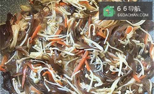 3蒜头炒香后放入金针菇、木耳、红萝卜、盐,翻炒均匀。